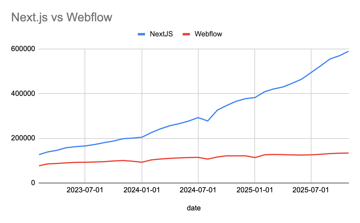 Keep in mind that Webflow is doing pretty well. They gained 56,000 sites over this time period. But NextJS took over for more than 463,000.