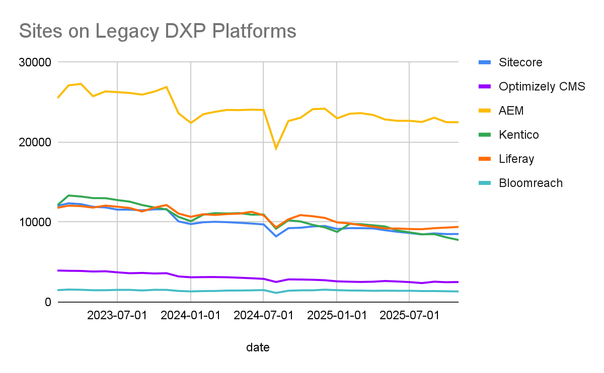 Querying over 1.4 Petabytes of crawl data for the past 34 months shows a remarkably steady picture of decline across all the big DXP vendors. There’s no way to avoid the bare fact: these platforms are directly delivering fewer digital experiences than they were just a few years ago.
