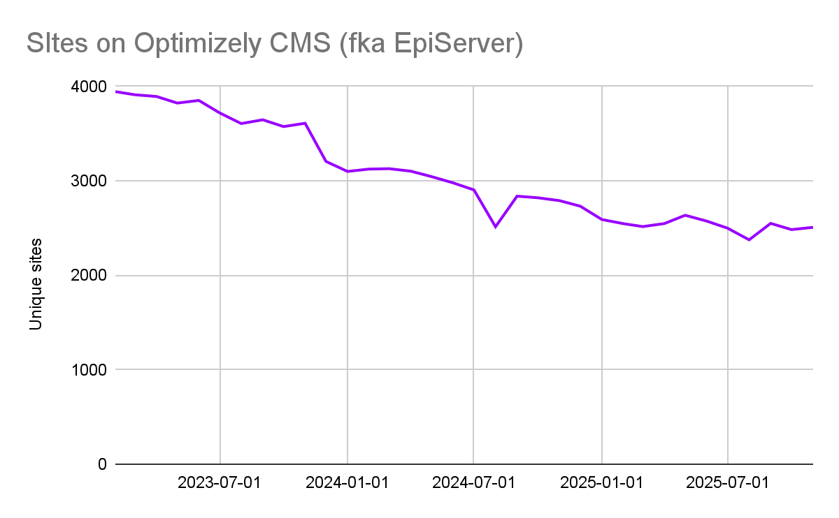 Again, we don’t need to speculate: the data exists to be queried. There are nearly 800 domain names that were powered by Optimizely’s CMS back in early 2023 that don’t fingerprint for that technology today. Only a handful of those (about 40) now run on a modern front-end. A chunk of the old urls (around 100) do redirect somewhere else, which is what you’d expect with consolidation, but in some of those cases the “somewhere else” isn’t running Optimizely anymore.